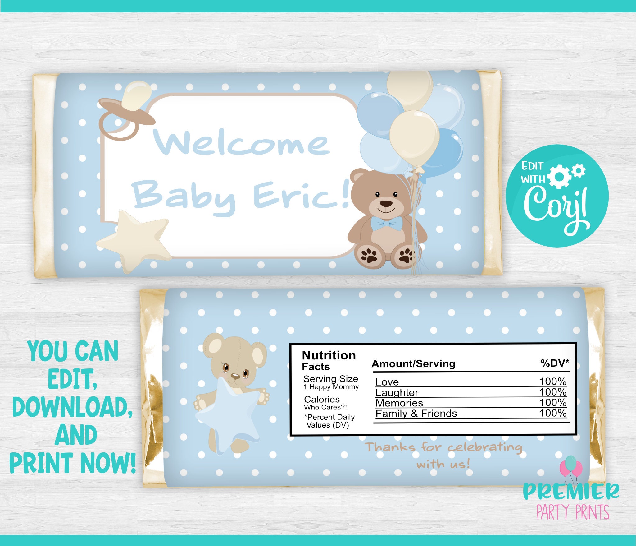 They fit over a standard size 1.55 oz. Perfectly designed and printed to match our baby boy teddy bear party theme, these amazing candy bar wrappers make great party favors and will look awesome on your candy buffet table. These cheerful treats are made from our signature milk chocolate and individually wrapped in colorful foil.