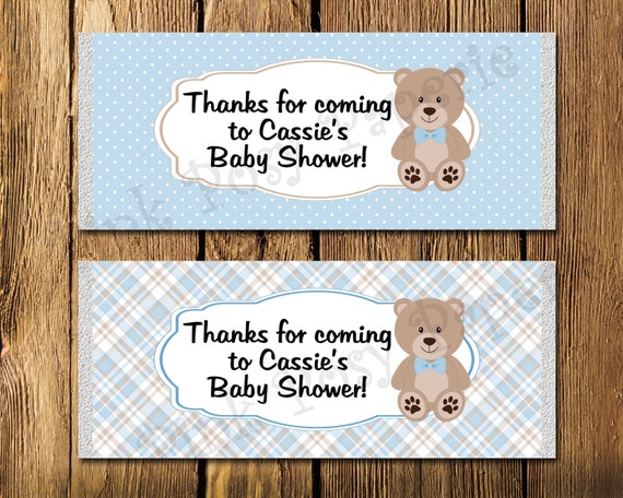 Baby boy teddy bear candy bar wrappers will make a fun addition to your next celebration. 3oz chocolate bar in a gift box; Labels for personalized water bottles, personalized wine bottles and personalized champagne bottles.